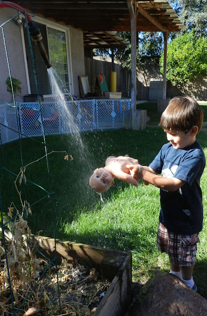 As our weather slowly transforms our neighborhood, the first thing we noticed is our outdoor toys that needed tending. Our dolls needed to be bathed, dried and put away. Watch the kids here do their very own clean up.